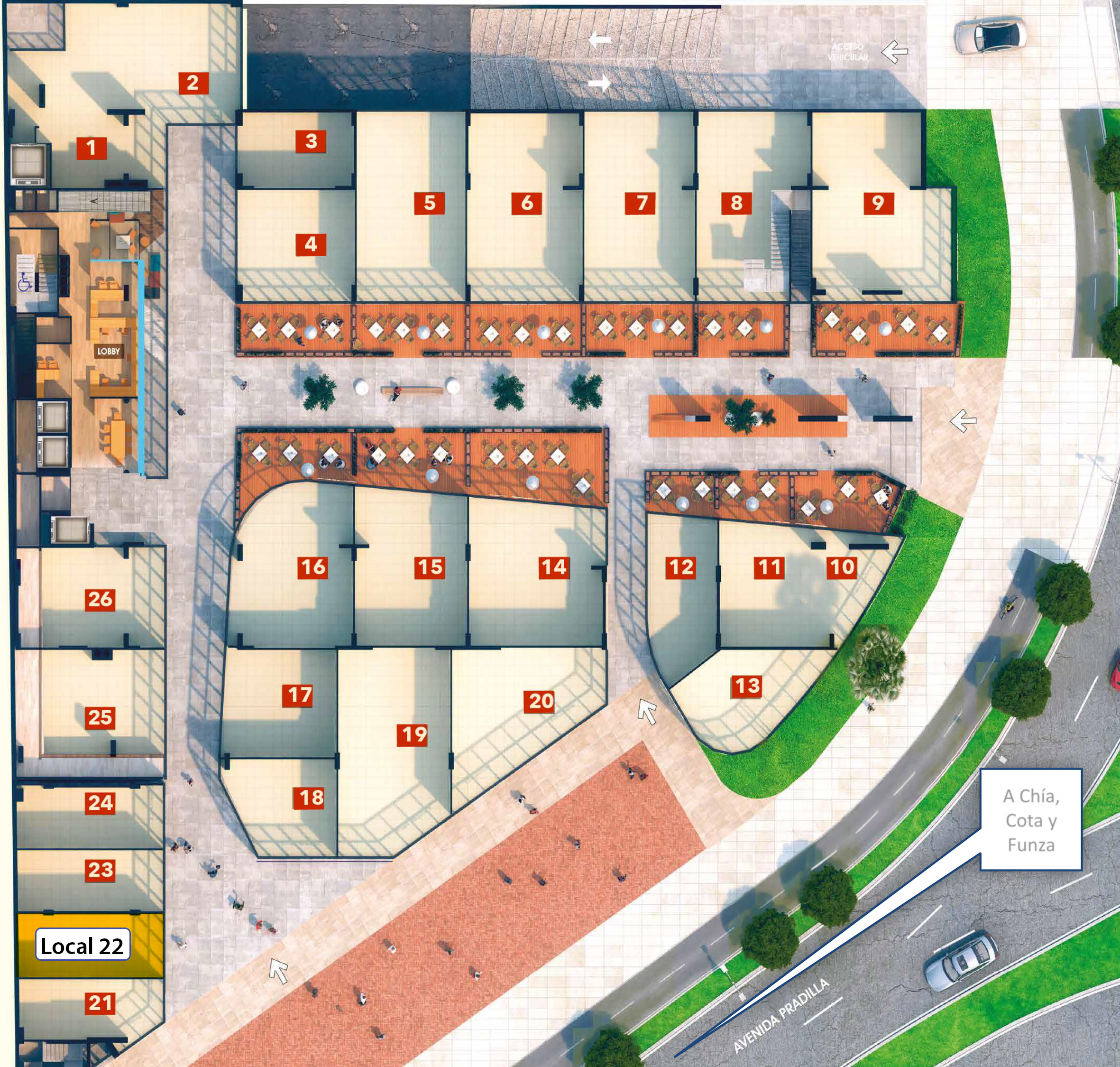 Ubicados sobre la Avenida Pradilla, una de las vías más transitadas y reconocidas de la ciudad, estos locales se posicionan como los más expuestos de todo Chía. Su amplia fachada acristalada funciona como una vitrina de gran impacto visual, ideal para captar la atención de transeúntes y conductores.